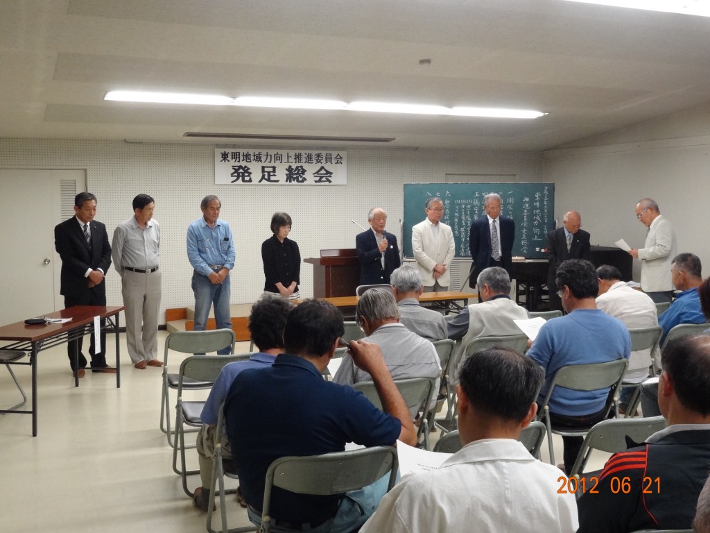 東明公民館において発足総会が開催され、出席者52名が見守る中、組織の名称や会則、役員の人選などについて承認を得ました。