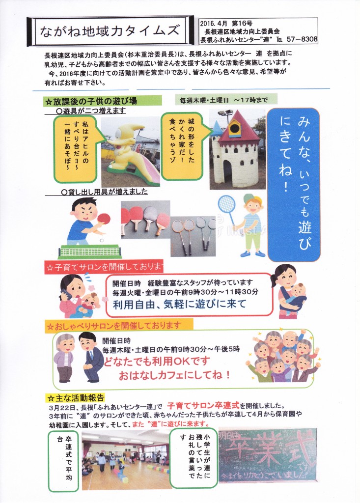 長根連区地域力向上委員会のPR紙「ながね地域力タイムズ」第16号(4月発行)を作成し長根連区各地域に回覧しました。(カラー版とモノクロ版があります) …