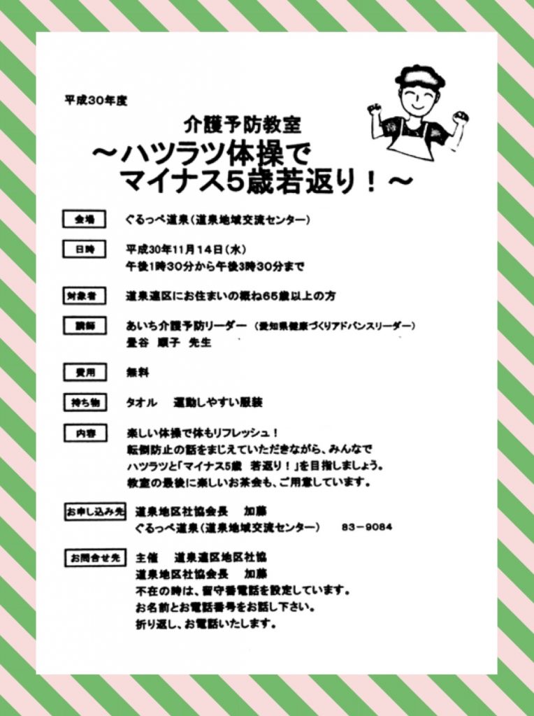 〜道泉地区社協よりお知らせです〜 【 介護予防教室〜ハツラツ体操でマイナス5歳若返り!〜 】 とき: 11月14日(水)午後1時3…