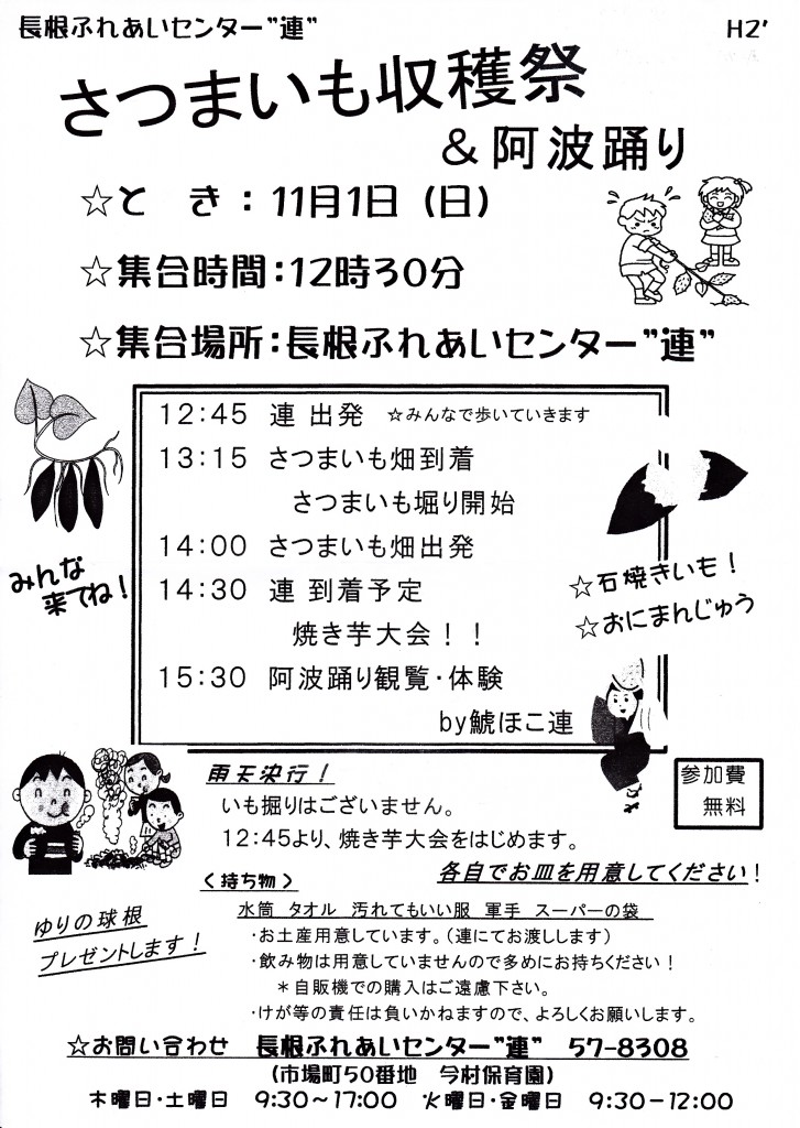毎年、恒例のさつま芋の苗植えを行います。 秋には、 さつま芋ほりを、体験し石焼き芋にします。 苗植えスケジュール …