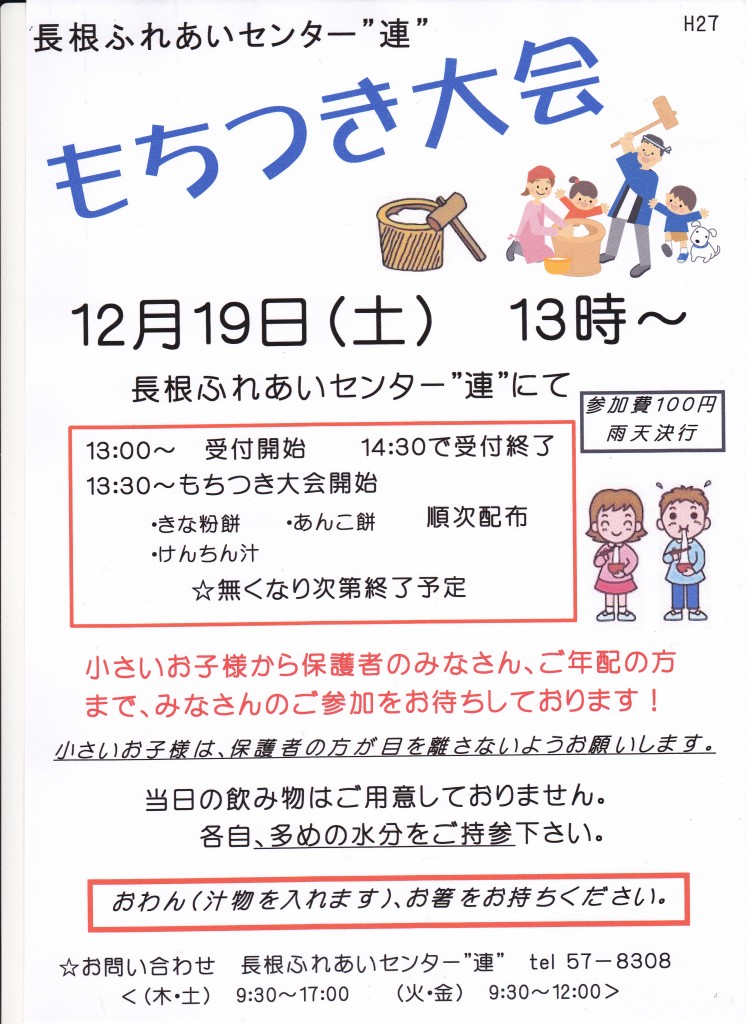 長根ふれあいセンター”連”で「もちつき大会」を開催します。 ついた餅を「きな粉餅」「あんこ餅」にして皆で食べます。けんち…