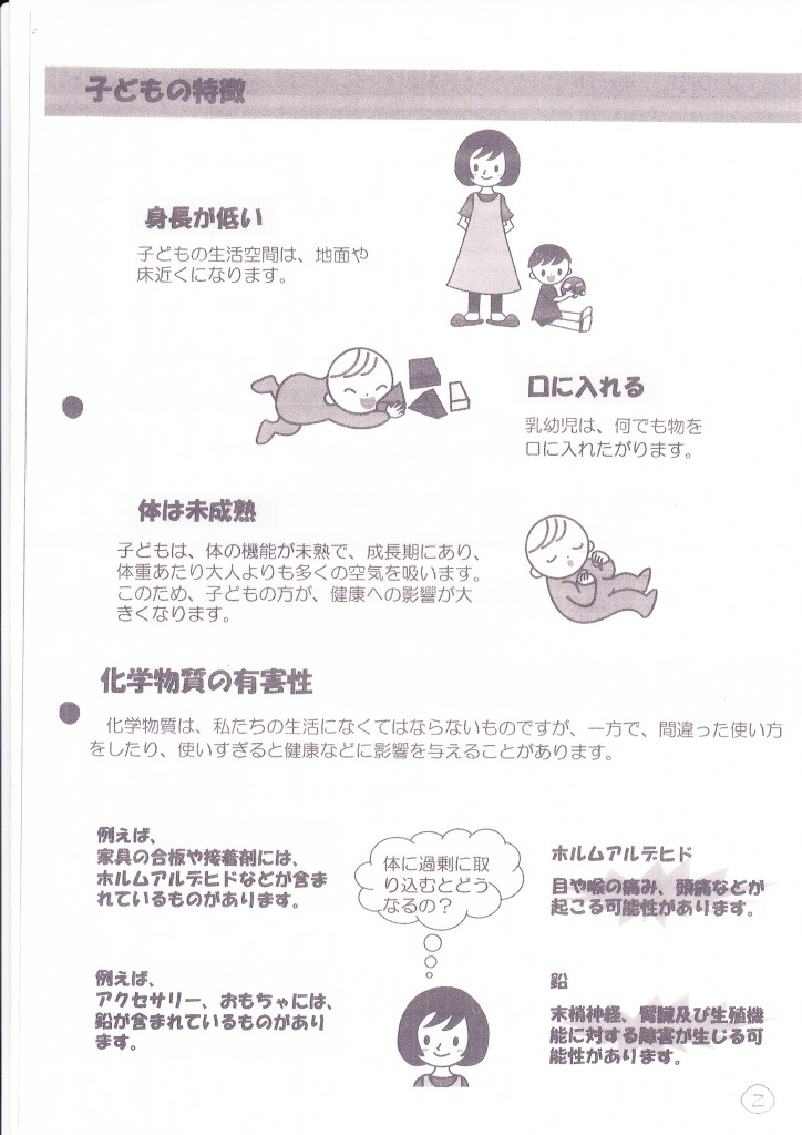 子供の接触を避けた方が良い化学物質、影響が疑われる症状、化学物質との上手な付き合い方等を学べます。