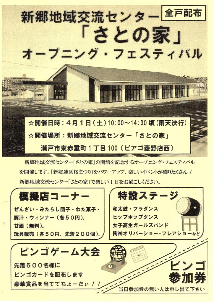 平成29年4月1日(土) 午前9時~午後3時頃 主催 : 新郷地域力推進協議会、新郷連区自治会 会場 : 新郷地域交流センター「さとの家」…